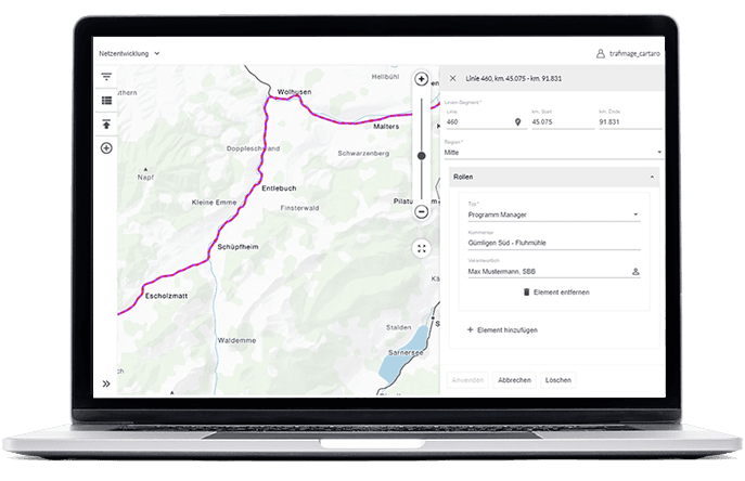 Die neue Kilometrierungs-Funktion kommt zum Beispiel bei der SBB zum Einsatz, um Verantwortlichkeiten zu Liniensegmenten zu verwalten und in der Webkarte "Koordinatoren Bahnnahes Bauen" anzuzeigen.
